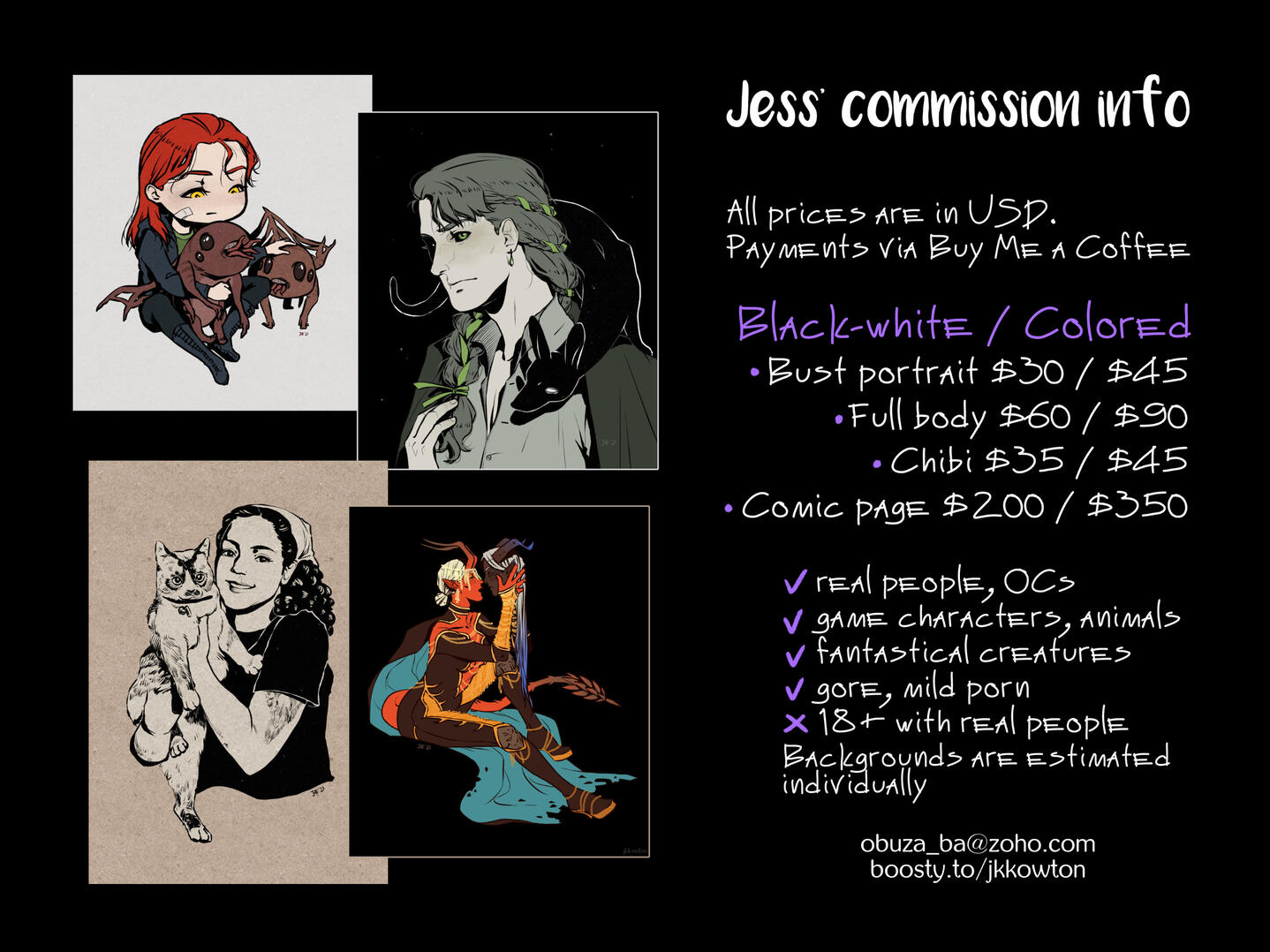 ToS and other information★ All commissions are for personal, non-profit use only! I retain full rights to the image. If you wish to commission me for commercial use, please email me, and we will discuss it.★ After I finish the commission, and you accept it, I will send you the high-resolution piece (that will be close to 300dpi A4 or more for complex illustrations) along with the scaled-down piece you may want to upload to your blog/website.★ Refunds are not provided. A significant amount of time goes into creating original work, so refunds are non-negotiable.
